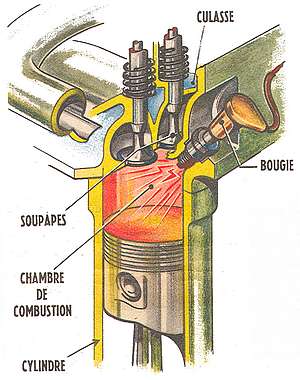 - Explosion-détente : le piston arrive en haut, une étincelle déclenche l’explosion du mélange qui repousse violemment le piston vers le bas. Les soupapes restent fermées, la température atteint 600 à 800°.