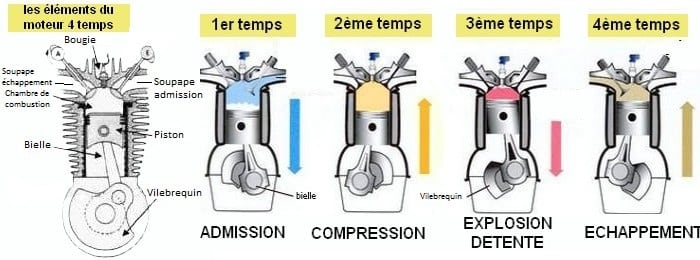 La combustion du mélange air-carburant s’effectue en quatre temps, d’où le nom de « moteur à 4 temps » que l’on retrouve sur la majorité des voitures. Ces quatre phases mobilisent les deux soupapes (admission et échappement), le piston, la bielle et le vilebrequin dans le cylindre :
