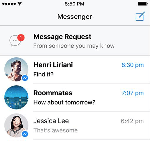 Cette demande apparaîtra sous forme de notification si l’utilisateur a activé les paramètres pour les recevoir, de sorte que vous êtes sûr que vous en serez informé immédiatement ou la prochaine fois que vous vous connecterez à Messenger. Veuillez noter que vous ne serez pas averti si un utilisateur a rejeté votre demande. Toutefois, si vous l’acceptez, vous pouvez parler normalement et recevoir des notifications pour chaque message. Sans la nécessité de s’ajouter les uns les autres en tant qu’ami.