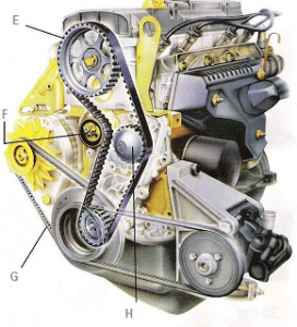 E : courroie dentée, F : galets tendeur, G : courroie accessoire, H : pompe à eau, I : joint de culasse